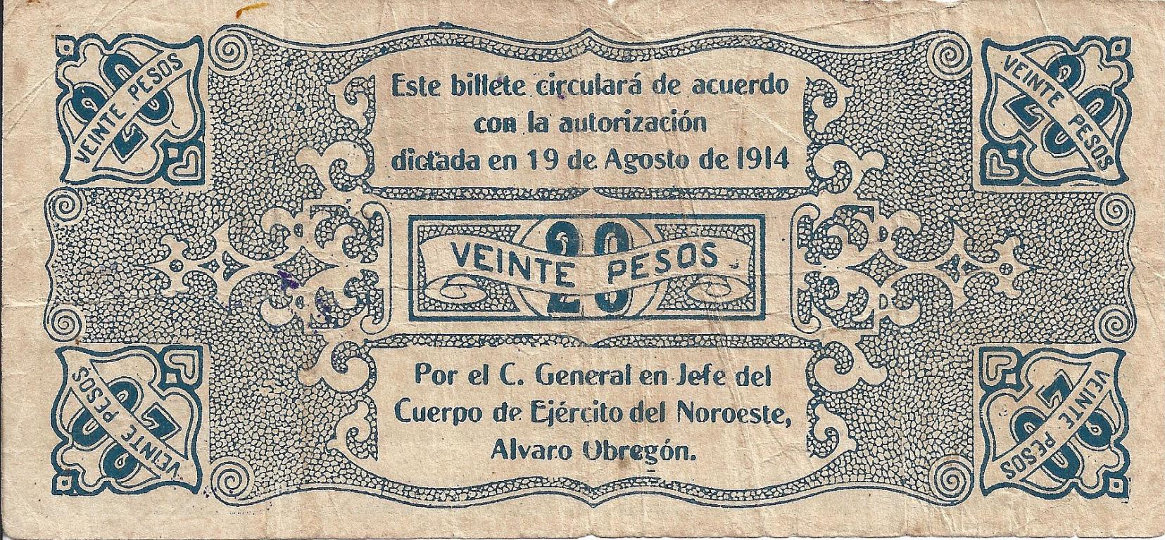 20 PESOS PAGADURIA GENERAL DE SINALOA (1914)