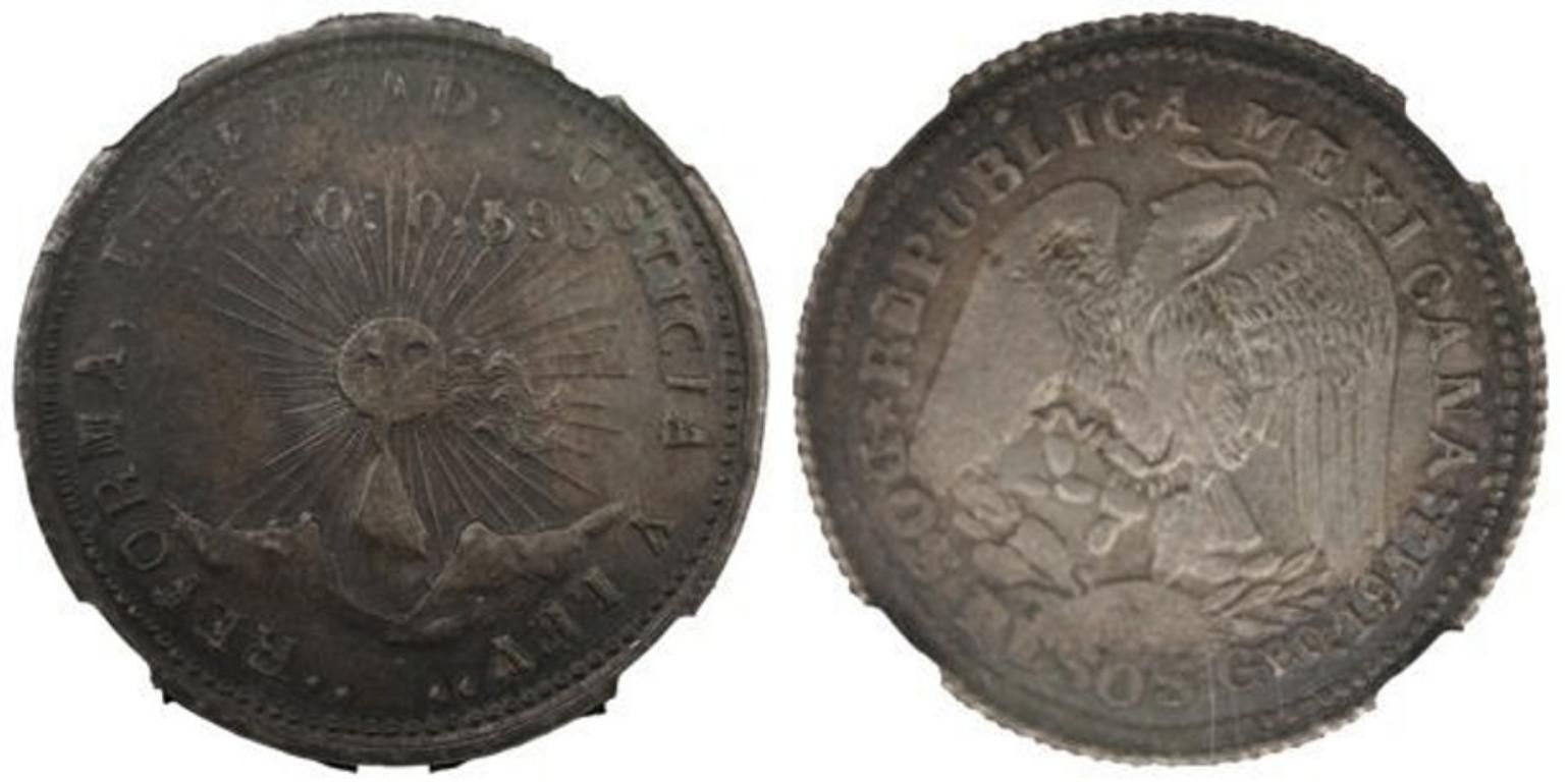 DESCRIPCIÓN ADICIONAL: machada, plata, patina oscura, GB-210, acuñación fuerte, atractivo, quizá merecía grado numérico, águila grande, muy atractiva