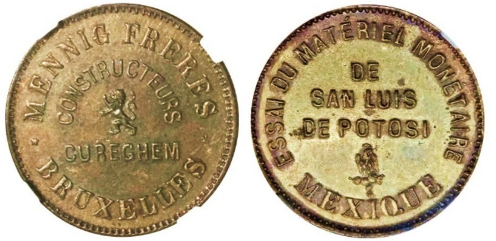 DESCRIPCIÓN ADICIONAL: Prueba-ensayo de 25 Centavos, San Luis Potosí, fabricante de maquinaria de la firma Belga “Menning Freres”, fueron acuñadas en la ceca Potosina para ajustar y calibrar la nueva maquinaria adquirida, NGC MS-62, latón, campos espejo, con brillo, se conocen en distintos metales y tamaños para los distintos valores en circulación, también catalogado en “Monedas Mexicanas. Pablo Gerber (1987)”, con el No. 27, pieza rara