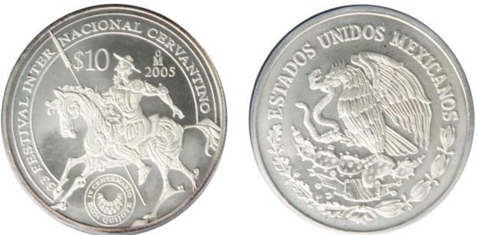 DESCRIPCIÓN ADICIONAL: onza plata ley 0.999, PCGS MS-69, emitida con motivo del 33 Festival Internacional Cervantino, distribuida en su momento de forma exclusiva a través de una empresa privada por la compra del libro de El Quijote, edición conmemorativa, muy escasa y en alta demanda